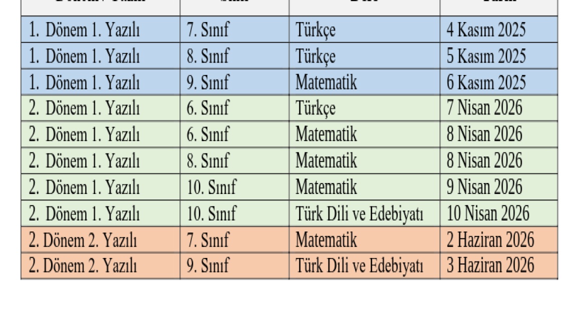 İlk kez 2023-2024 eğitim öğretim yılında gerçekleştirilen ülke geneli ortak yazılı sınavların başarılı sonuçlar vermesi üzerine, yeni eğitim öğretim yılında da ülke geneli ortak yazılı sınavlar yapılacak.   2025-2026 eğitim öğretim yılına ilişkin belirlenen ortak yazılı sınav takvimine göre, yeni eğitim öğretim yılında 6, 7, 8, 9 ve 10. sınıf düzeylerinde ülke genelinde toplam 10 ortak yazılı sınav yapılması planlanıyor.   Yayımlanan takvime göre 1. dönem 1. yazılı sınavları Kasım 2025'te; 7. sınıf Türkçe dersi için 4 Kasım Salı, 8. sınıf Türkçe dersi için 5 Kasım Çarşamba, 9. sınıf matematik dersi için 6 Kasım Perşembe günü gerçekleştirilecek.   2. dönem sınavları 1. yazılı sınavları Nisan 2026'da; 6. sınıf Türkçe dersi 7 Nisan Salı, 6. sınıf ve 8. sınıf matematik dersi 8 Nisan Çarşamba,  10. sınıf matematik dersi 9 Nisan Perşembe ve 10. sınıf Türk dili ve edebiyatı dersi için 10 Nisan Cuma günü yapılacak.   2. dönem 2. yazılı sınavları ise Haziran 2026'da; 7. sınıf matematik dersi için 2 Haziran Salı,  9. sınıf Türk dili ve edebiyatı dersi için 3 Haziran Çarşamba günü uygulanacak.   Bu sınavlarda kullanılacak açık uçlu sorular, öğrencilerin konuyu ne kadar anladığını ortaya koymanın yanı sıra, öğretmenlerin öğrencilere nasıl geri bildirim vereceği ve öğrenme sürecinin nasıl şekilleneceği konusunda da önemli veriler sağlayacak.   Bu uygulama ile öğretmenler, sınıf ortamında öğrencilerin gelişimini daha yakından izleyebilecek; ülke genelindeki sınav sonuçları ise akademik başarı seviyelerinin değerlendirilmesine olanak tanıyacak. 22-09-2025